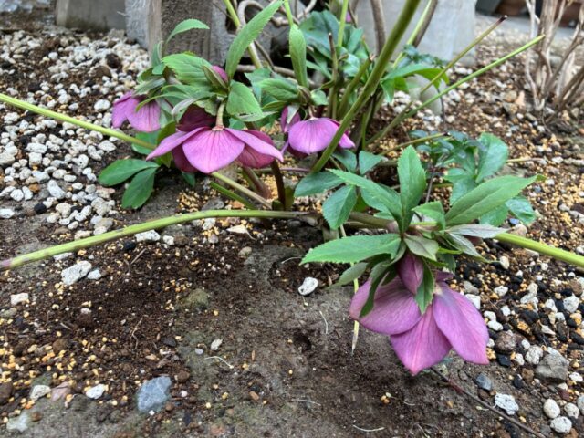 紫色はクリスマスローズ、この二つは毎年お花を咲かせてくれます。